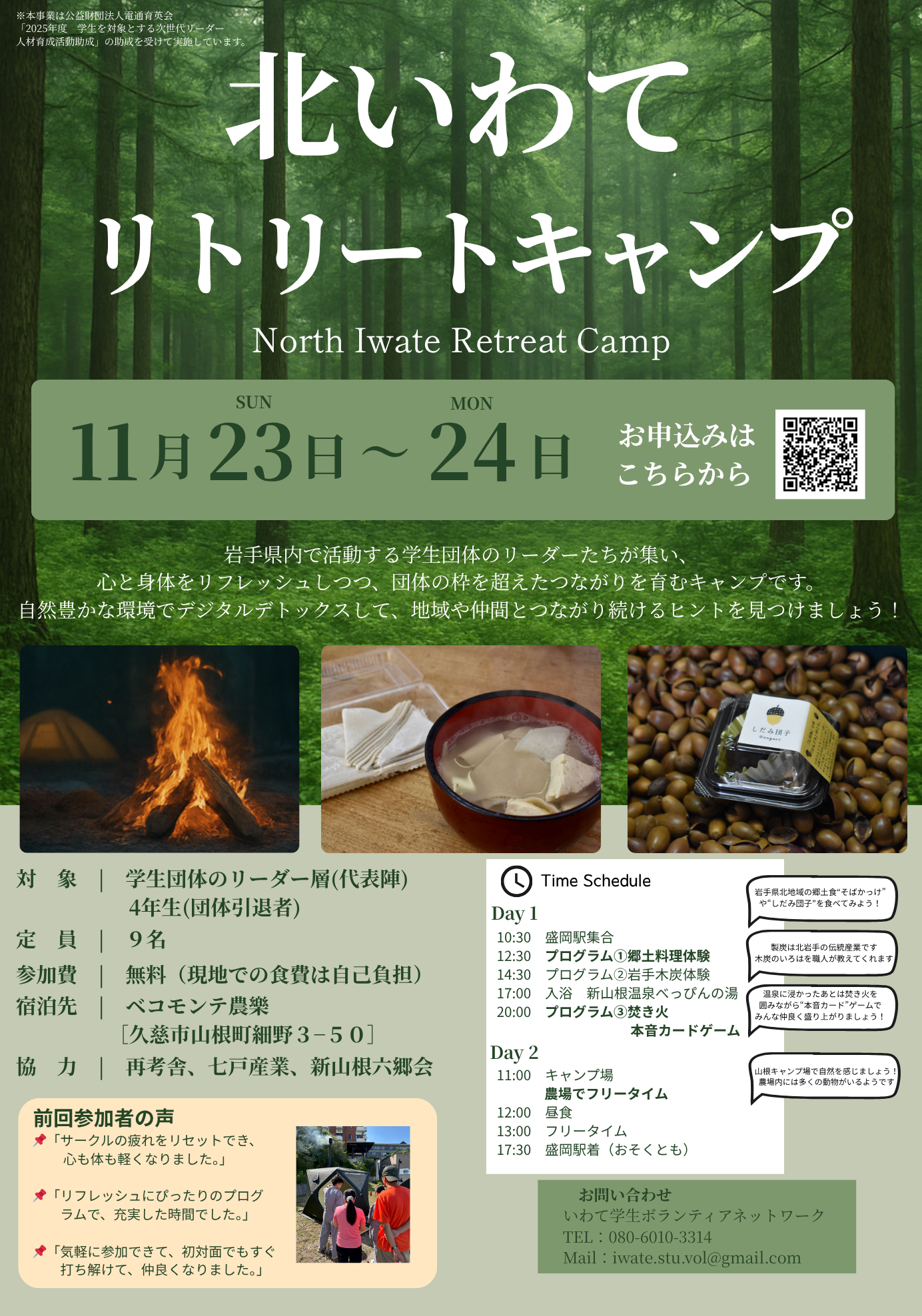 2025年10月20日 / 最終更新日時 : 2025年10月20日 iwatesvn 北いわてリトリートキャンプポスター_最終版 Bluesky コメントを残す コメントをキャンセルメールアドレスが公開されることはありません。 ※ が付いている欄は必須項目ですコメント ※ 名前 ※ メール ※ サイト 次回のコメントで使用するためブラウザーに自分の名前、メールアドレス、サイトを保存する。 Δ