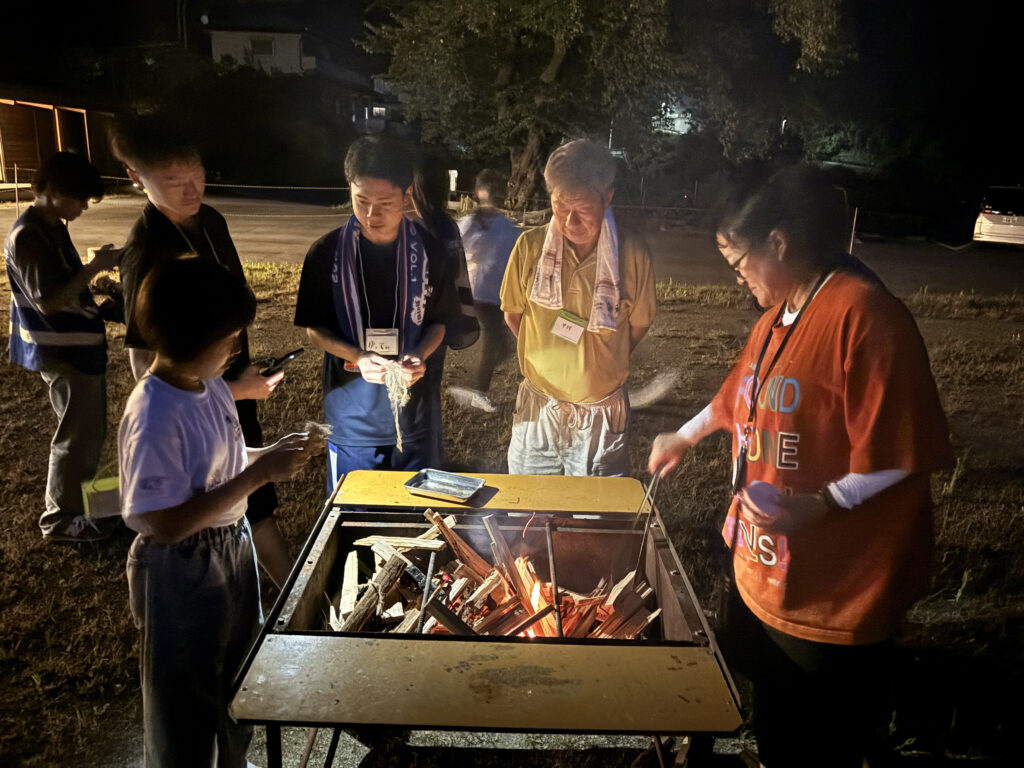 7月26日(土)、27日(日)は本番として1泊2日で実施。当日は大槌町内の親子連れ、地域住民の他、静岡県の高校生、日本福祉大学災害ボランティアセンターの大学生など約40名以上の方々が参加されました。当日はカレーなどの飯盒体験、薪割りからの火おこし体験、実際に避難所用テントを設置しながら避難所生活を疑似体験しました。子ども達が上手くいかない時もいきなり手を貸さず、トライアンドエラーを繰り返しながらやり方を学ぶことを大切にしながら子ども達の体験をサポートしました。夜は運営サポートをした大人の皆さんと一緒に反省会をしながら、大槌町の地域のことや、今後の展望について語り合う時間を過ごしました。