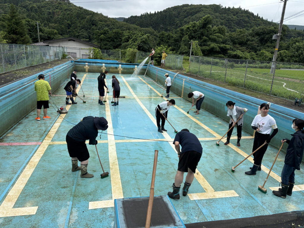プール掃除は地元の消防団の方々と協力しながら和気あいあいと交流しながら活動でき、暑い夏にはピッタリな活動でした。