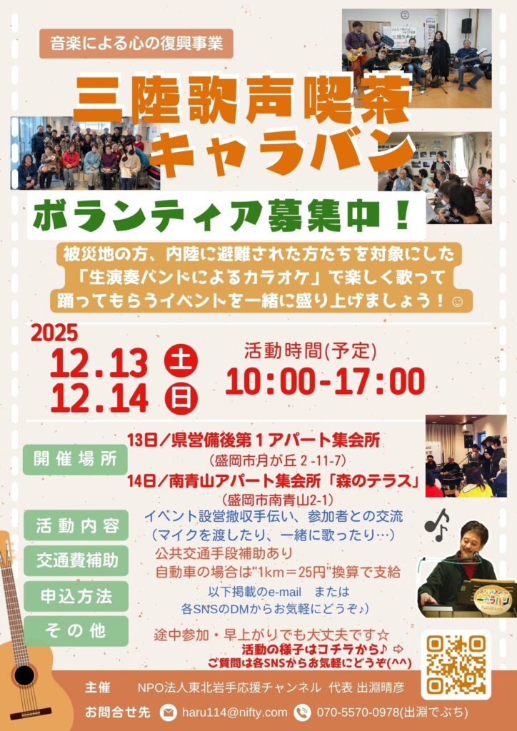 NPO法人東北岩手応援チャンネルでは、令和7年12月13日(土)・14日(日)に盛岡市で開催される「三陸歌声喫茶キャラバン」のお手伝いに協力いただけるボランティアを募集しています。「三陸歌声喫茶キャラバン」とは東日本大震災で被災された方々の心の復興支援として、「生演奏バンドによるカラオケ」で楽しく歌って、踊ってもらうイベントです。ぜひ、一緒にイベントを盛り上げてみませんか?