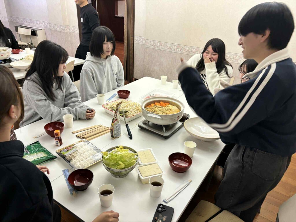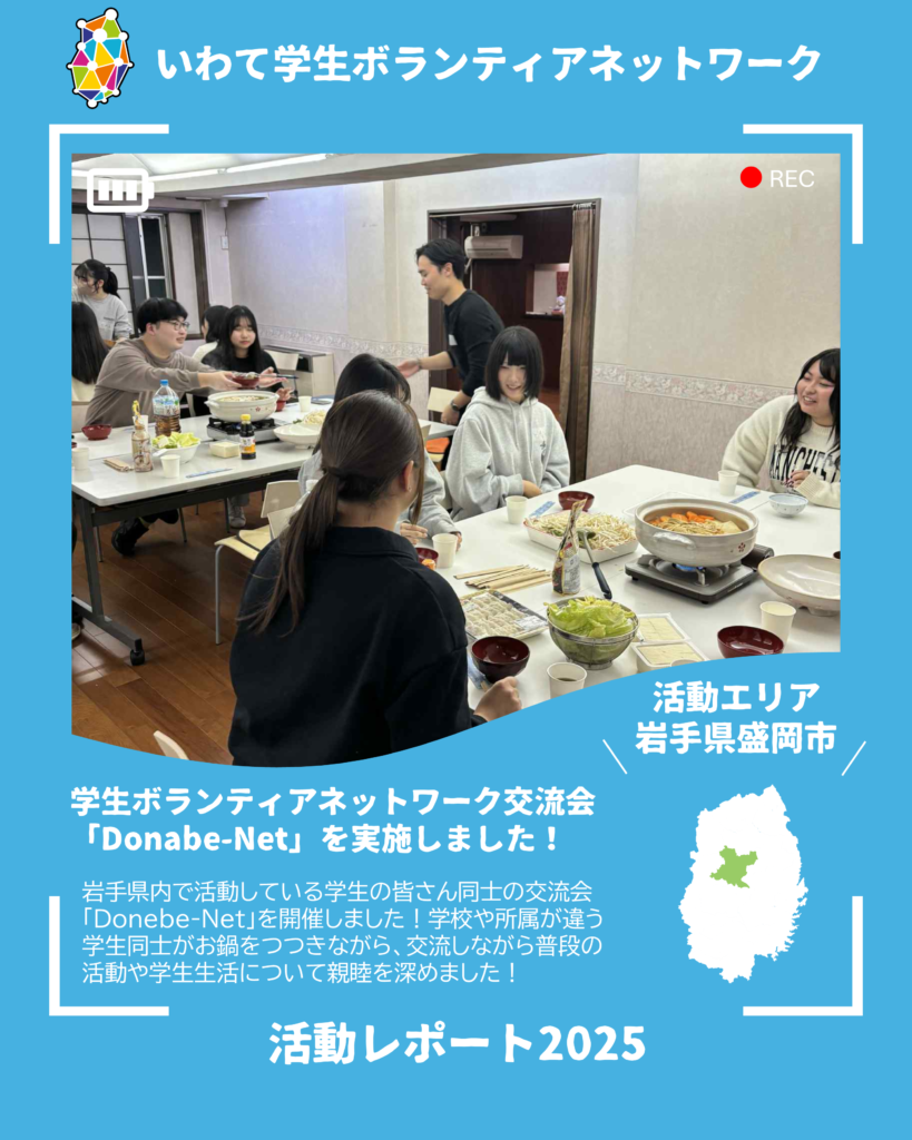 「Donabe-Net」とは元々、岩手県立大学学生ボランティアセンターが始めた地域交流活動の一つで、「Donabe(土鍋/Do nabe=お鍋でもしましょう)」を通じて「Network(つながり、ネットワーク」を紡いでいく活動です。今回は学生のみの開催でしたが、はじめましての学生同士がお鍋をつつきながら、「お鍋よそいますよ」と話しかけながら自然と交流が生まれていく時間となりました!