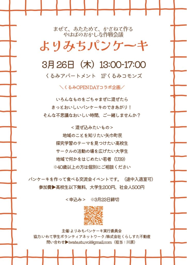 3月26日(木)に矢巾町・くるみアパートメントを会場に「よりみちパンケーキ」を開催します!