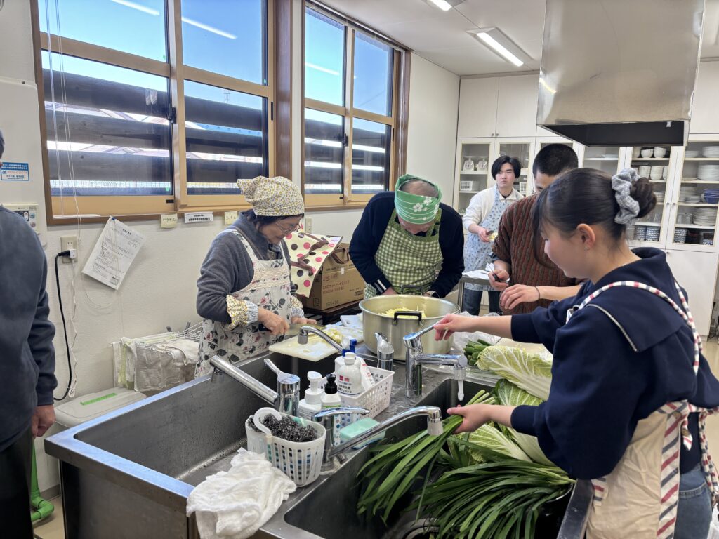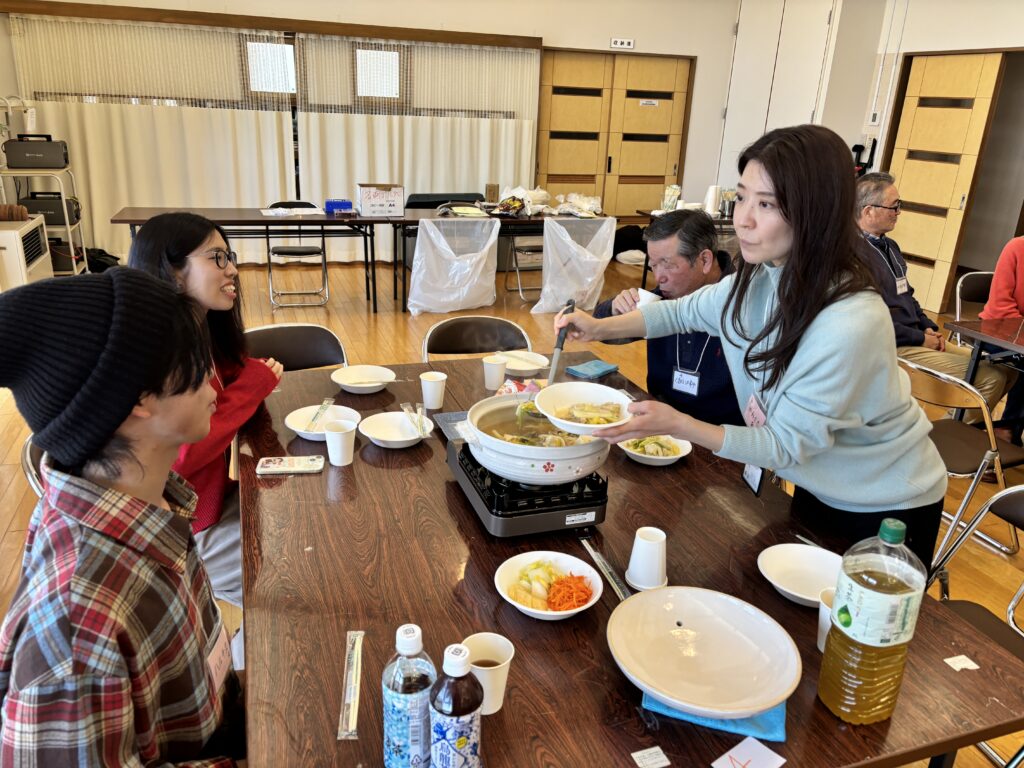 まずは会場準備。川前自治会の皆さんと一緒に机のセッティングから鍋の下準備を行っていきました。準備では「お名前は何と言うの?」「普段料理している?」、などと和気あいあいと話しながら準備を進めていきました。料理は一番のアイスブレイクですね。
