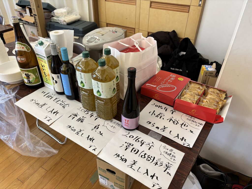 同じテーブル同士で「お鍋よそいましょうか?」、「飲み物は何を飲まれますか?」と自然とコミュニケーションが生まれ、次第に普段の大学生活や川前地域のことなど色々な話題に発展していきました!また、今回は久しぶりのDonabe Netの開催ということもあり、当時学生ボランティアセンターで活動していたOBOGの皆さんもたくさん駆けつけていただきました!(差入れもたくさん!)