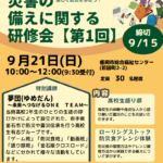 2025年9月7日 / 最終更新日時 : 2025年9月7日 iwatesvn イベント案内 【ご案内】「災害の備えに関する研修会」参加者募集 「盛岡市社会福祉協議会」様よりご案内です。 9月21日(日)、盛岡市総合福祉センターを会場に「災害の備えに関する研修会」が開催されます。本研修会は、各地で大規模災害が発生し多種多様なボランティア活動や災害時支援または防災 […]